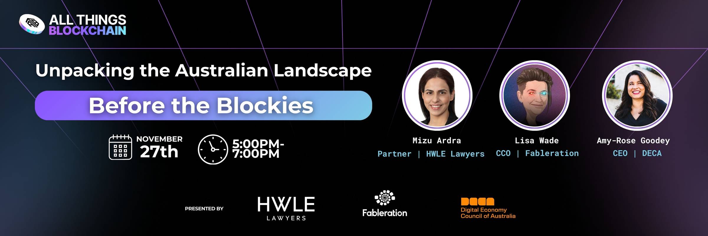 We had an amazing lineup of speaker who shared their insight on the current landscape Mizu Ardra provided a high-level overview of where Australian regulation sits globally. Amy-Rose Goodey will spoke to the evolution of the DLT space and Digital Economy Council of Australia (DECA) vision. Lisa Wade (she/her) will close out by sharing the latest from Fableration.